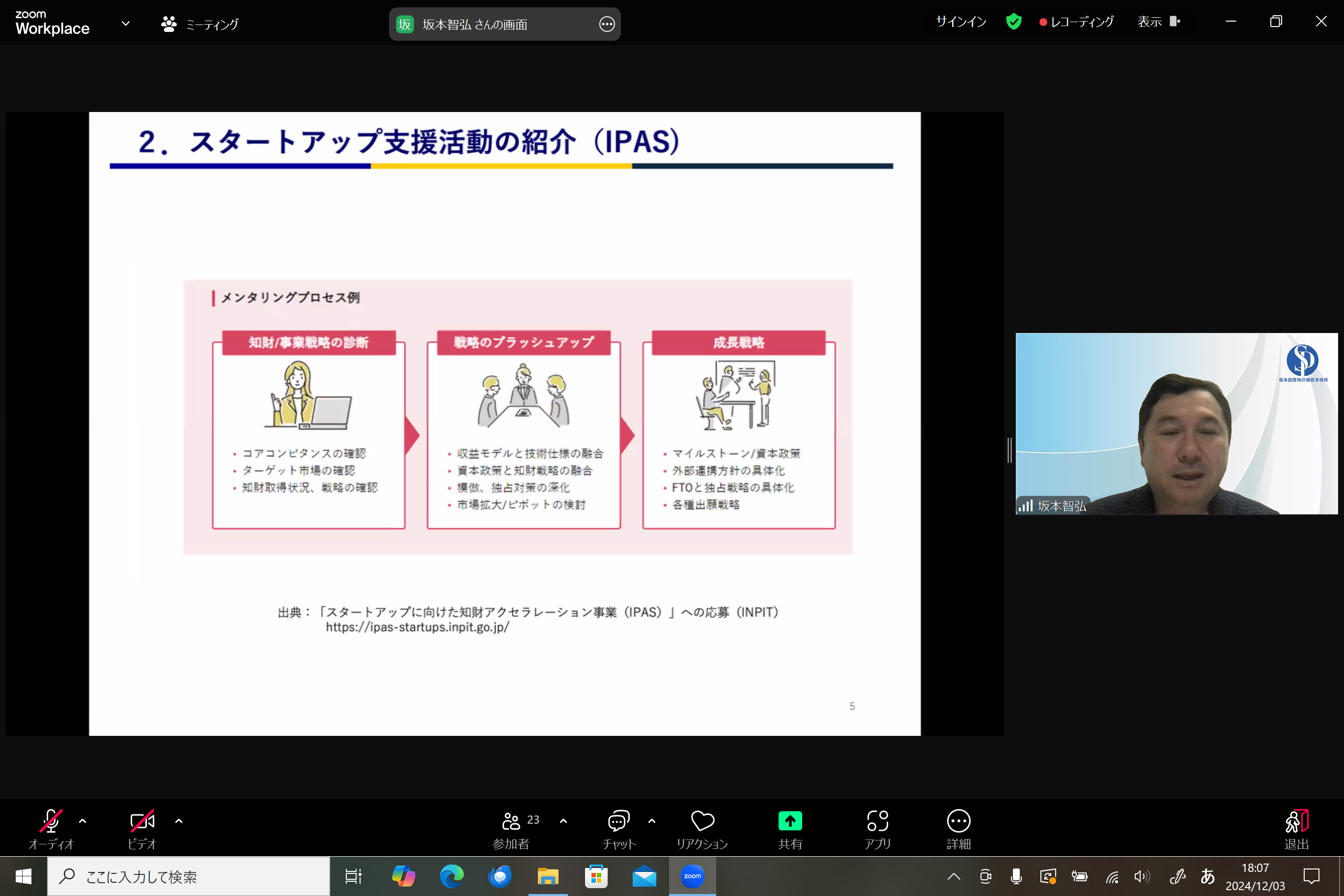 坂本国際特許商標事務所 所長 弁理士 坂本智弘 氏に講師として参加いただき、「~スタートアップと知財活動~」をテーマにご講演いただきました。